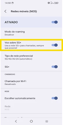 Para ativar o VoNR no seu equipamento Android, certifique-se de que o 5G+ está ativo, e que a opção “Voz sobre 5G+” está ativa