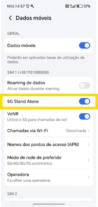 1. Verifique se a opção “5G Stand Alone” está ligada;