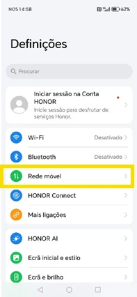 • Atualização Operadora: “Definições” > “Rede Móvel” > “SIM” > “Seleção de Operadora” (se aparecer a opção).