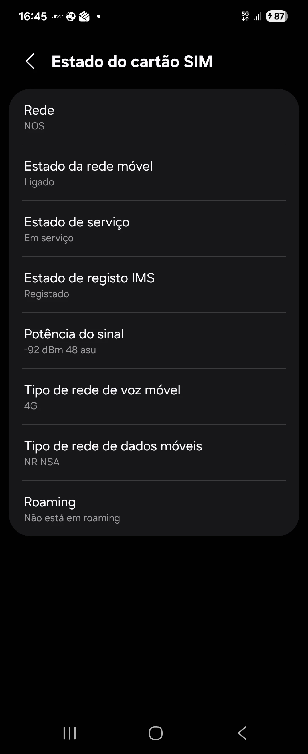 Como se pode ver no “Field Test Mode”, a intensidade do sinal (RSRP) é boa e está ligada à banda n78 na rede 5G.