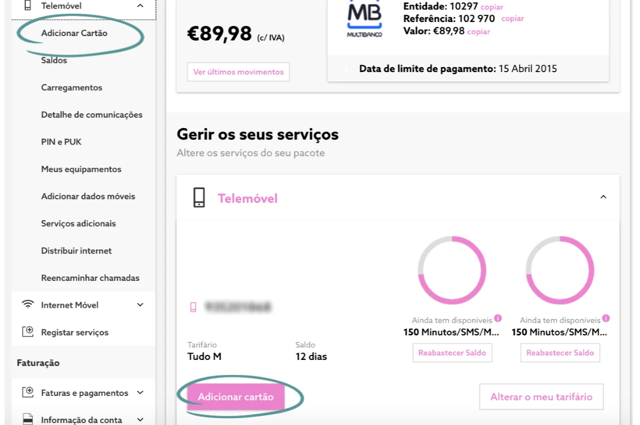 - Aceda à sua Área de Cliente. De seguida selecione a opção “Adicionar Cartão” em "Telemóvel" e escolha a opção "Adicionar Cartão". Em alternativa, no menu principal, selecione “Gerir Serviços” e de seguida clique em "Adicionar cartão";