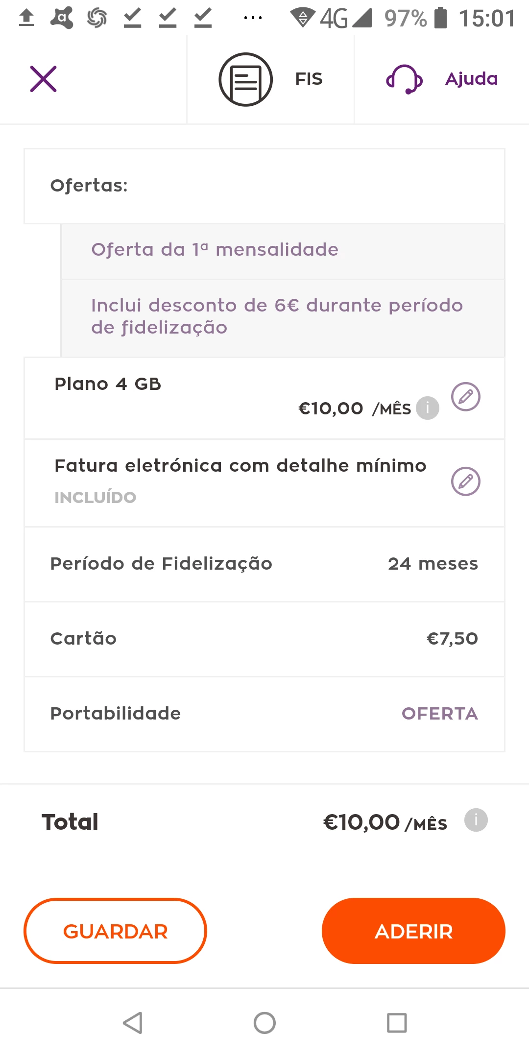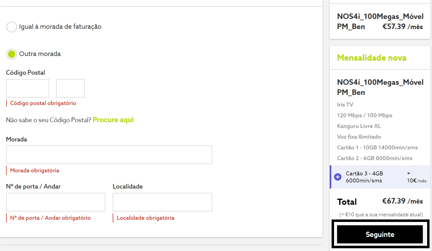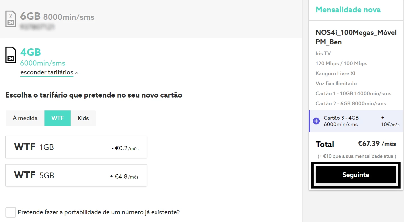 - É apresentada a informação do seu pacote atual e mensalidade, onde pode simular o valor a pagar. Caso pretenda fazer a portabilidade de um número já existente, selecione a respetiva opção e insira dos dados pedidos. Para avançar, clique em "Seguinte";