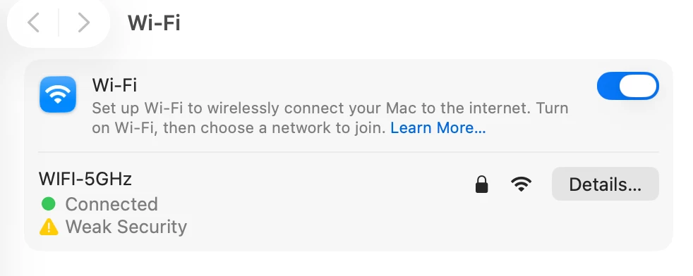 o modo de segurança do wi-fi 2.4 Ghz e 5 Ghz vai para o padrão WPA + WPA2 (programado no firmware do router) em vez do mais seguro WPA2. Quando isso acontece, o meu computador avisa me que o wi-fi não está seguro.