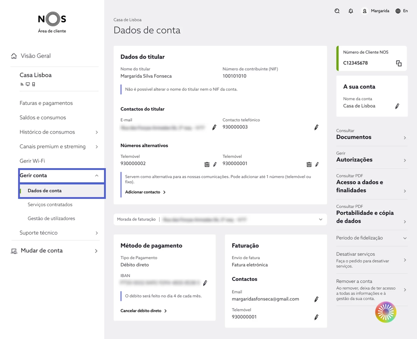 O contacto telefónico do titular é o número de telemóvel principal que serve para receber comunicações e informações da NOS. Ao alterar o telemóvel do titular, o antigo número passa para a lista dos números alternativos.