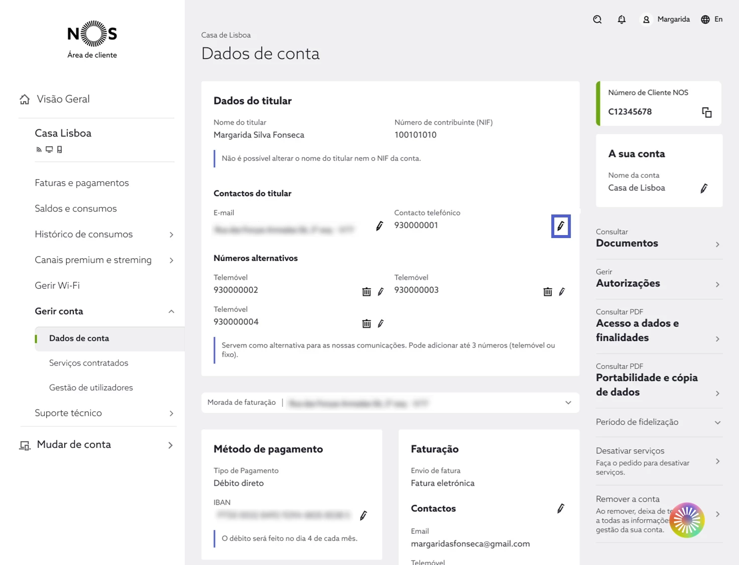 - Veja os dados da sua conta e, em “Contacto do titular”, selecione o ícone do lápis;