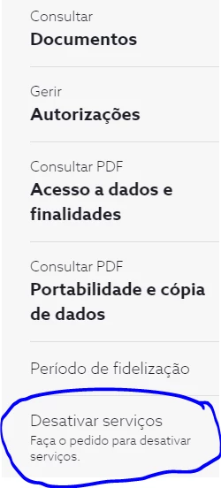 Quando fui á area de cliente da nos e tentei seguir o processo lá também fui a:  Gerir Conta - Dados da conta - Desativar o seu serviço também não me deixa e diz que não tenho contacto nenhum associado.