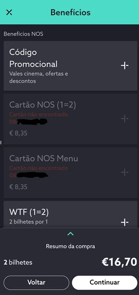 Consigo visualizar o meu cartão NOS na App Nos Cinemas, mas quando quero comprar bilhetes não consigo selecionar a opção Cartão NOS (1=2), porque dá a mensagem cartão não encontrado.