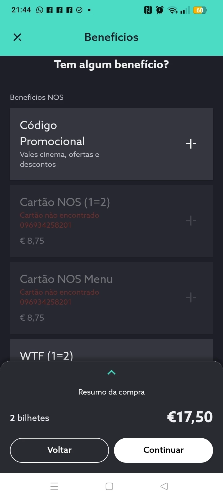 Quando estou na aplicação Nos Cinema o indica cartão não encontrado e não posso usufruir da promoção 1=2 bilhetes