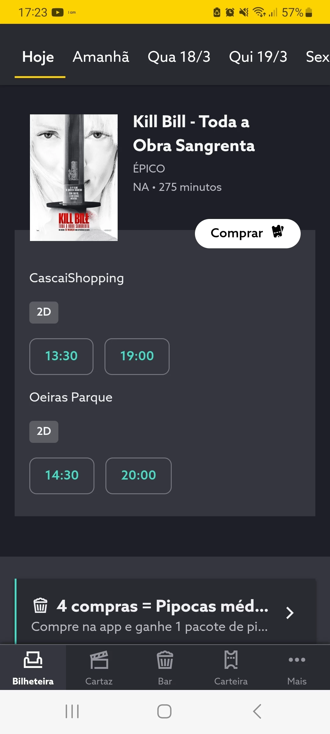 Isso já tenho. A questão é que costuma aparecer todos os filmes em exibição naquelas salas e agora só aparece um filme. Nos dias seguintes também.  Sou só eu com este problema? Vou experimentar desinstalar a app e instalar de novo, talvez funcione...