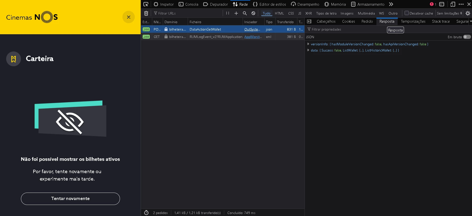 Pelo Developer Tools do browser, ao entrar na carteira, é possivel ver na imagem abaixo, que ao tentar ir buscar os items da minha carteira, devolve um Sucess a false.