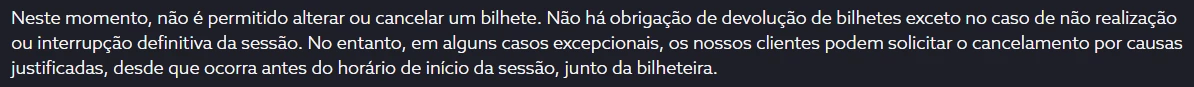 Conforme descrito nos termos e condições Cinemas NOS, a impossibilidade de comparência do cliente no dia e hora da sessão ou o erro na escolha dos bilhetes não conferem o direito a alteração ou devolução do valor dos mesmos.