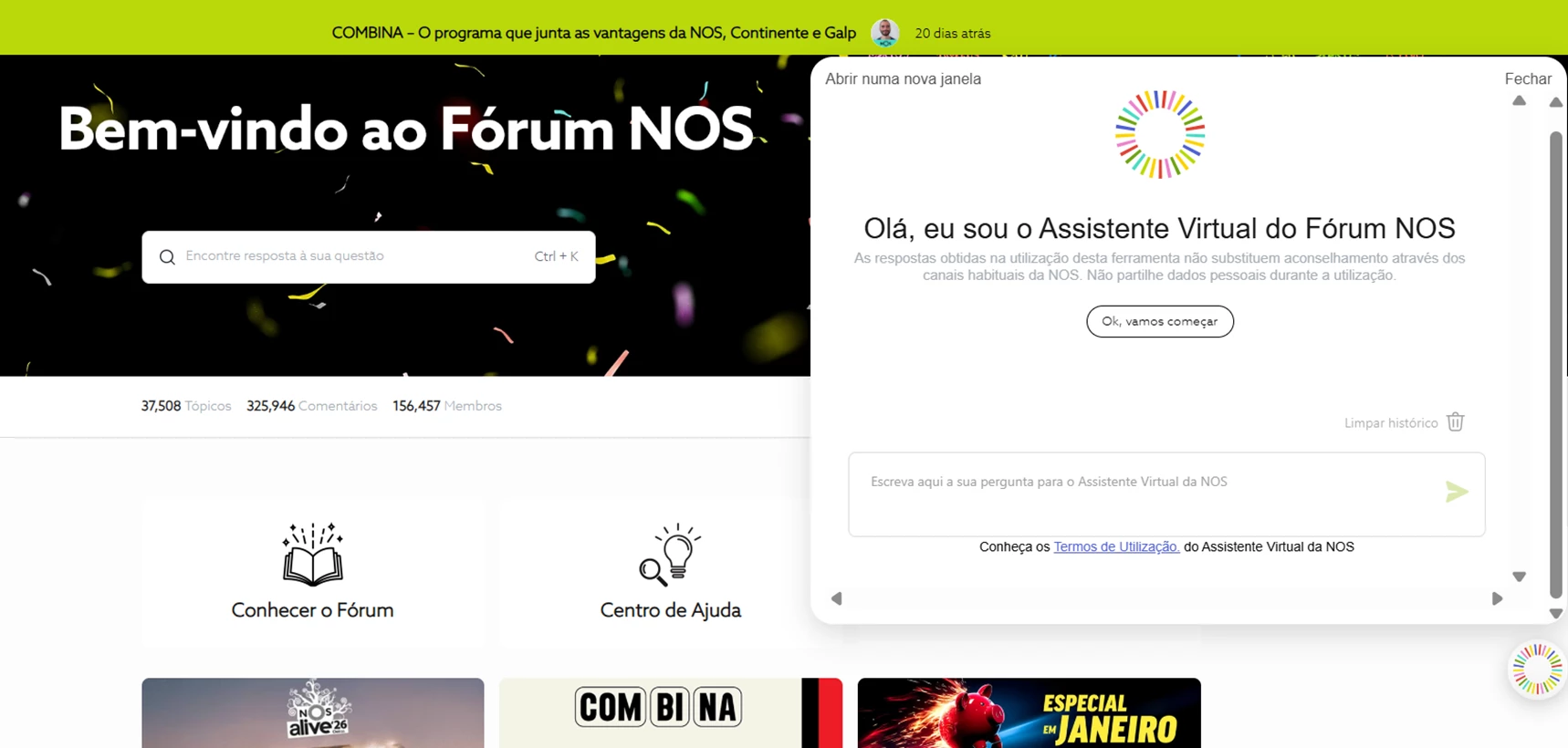 Assistente Virtual do Fórum NOS vai ajudá-lo a encontrar resposta às suas questões mais rapidamente e também artigos que possam ser do seu interesse para esclarecimentos adicionais. Este está também disponível através de uma página independente em: https://forum.nos.pt/p/assistentevirtual