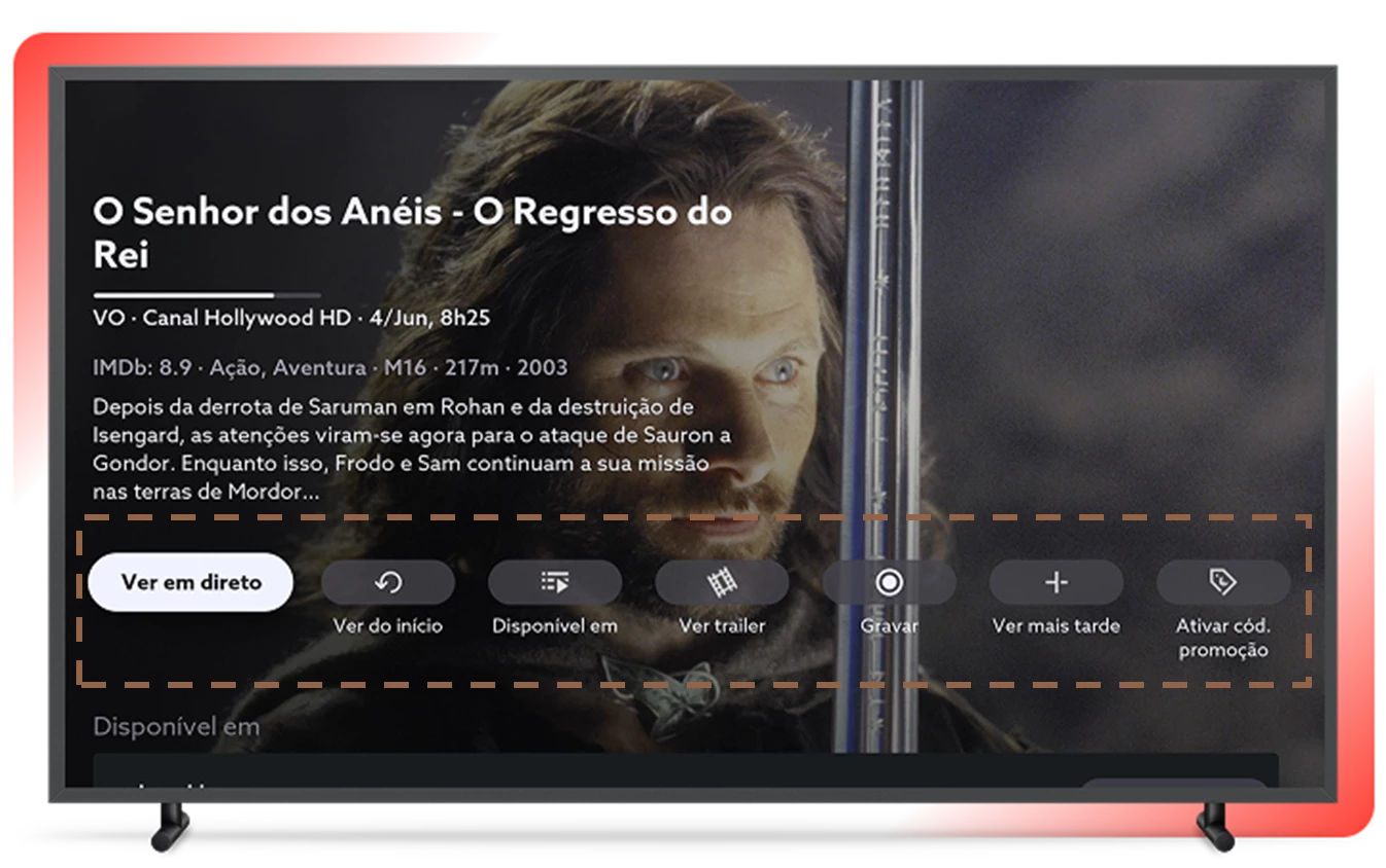 Pressione (i) no comando da box para aceder à informação de detalhe do programa, onde pode marcar para ver mais tarde, gravar, explorar conteúdos relacionados e muito mais.