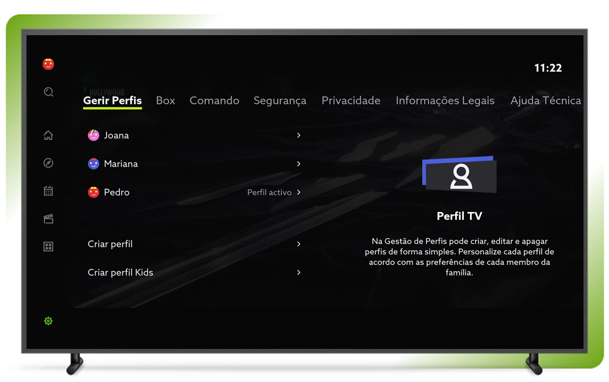 Personalize a sua experiência de televisão. Nas definições, crie o seu perfil e tenha recomendações personalizadas para si.