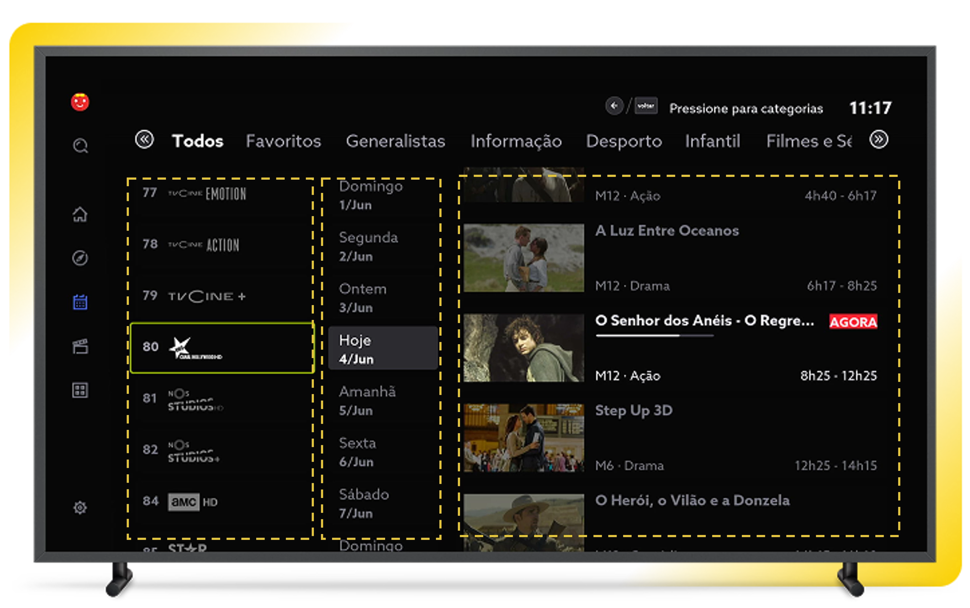 Pressione a tecla “voltar” do comando para entrar na navegação dos canais por categorias.
