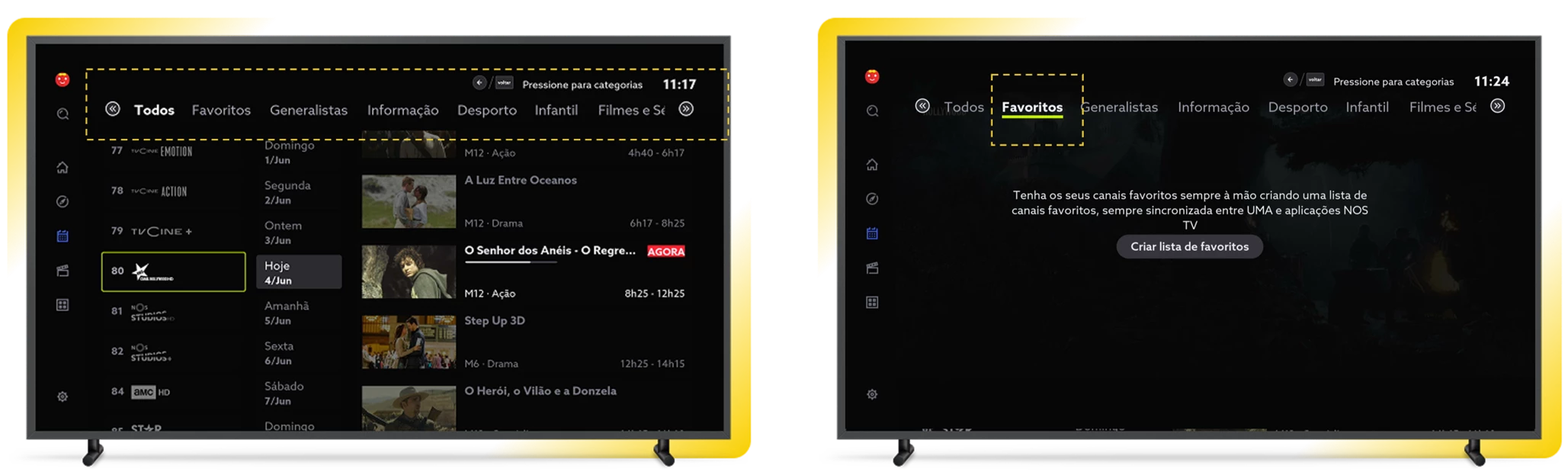 Na categoria Favoritos, crie a sua lista de canais favoritos e altere-a sempre que quiser.