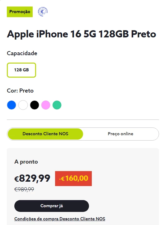 Mas mais, a NOS mente descaradamente quando apregoa um desconto de €160 para os seus clientes e engana-os com o preço após o desconto e marcado na montra. Tudo isto é facilmente comprovável, pois acabei de comprar o mesmo Iphone 16 na Worten por €834,99. E, a este preço, tem muitos mais para vender aos clientes de qualquer operadora. Quaisquer dúvidas soçobram consultado a loja online da Worten.