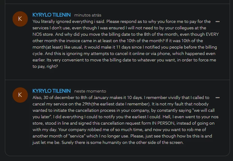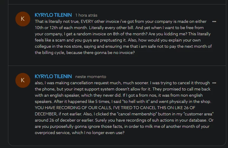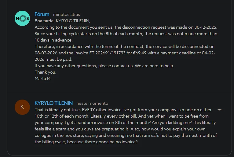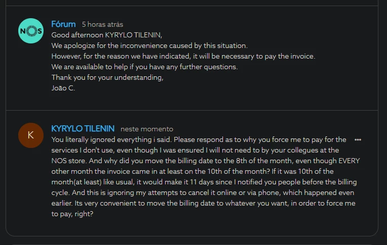 After numerous attempts at cancelling the service through the phone/website, I decided to go the the nos shop directly to do so in writing, as someone on the internet suggested. After this, I asked NOS staff which was assisting me: “Am I good, will i need not to pay for the following month?”. To which they replied: “Nope, only the cancellation fee of 75.58 euros”. I rephrased this question numerous times just to “be safe”. Lo behold, billing cycle comes, and I get another invoice as if no cancellation happened. Basically I need cancellation of the invoice now as well. Please help, I don’t want to go to nos store anymore, it is not nearby at all. Its been extremely frustrating experience with service cancellation already, and I just want it to be over. Just let me pay my cancellation fine and be free of this company. Thanks.