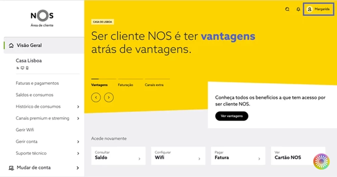 Na página inicial da my NOS, através do ícone do Assistente Virtual NOS indique o assunto ou a questão que pretende esclarecer para obter uma resposta rápida às suas dúvidas.