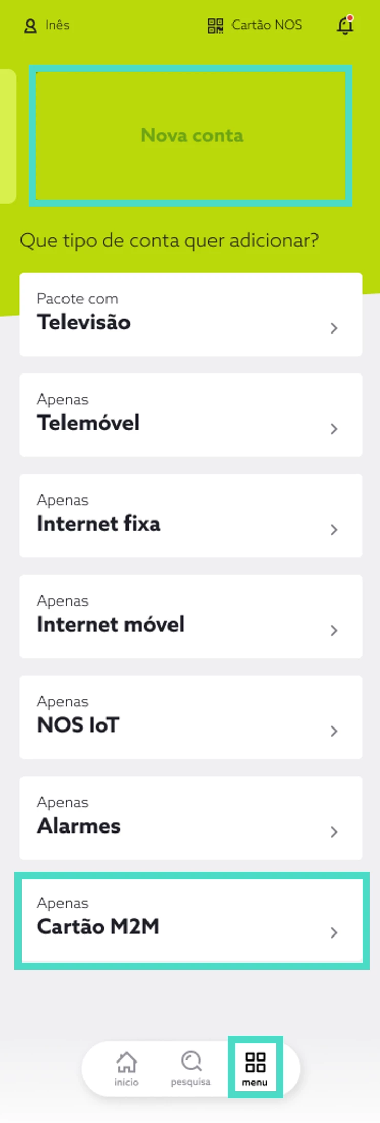 - Aceda à app my NOS e, em “Menu”, escolha “Nova conta”. De seguida, escolha “Apenas Cartão M2M”;