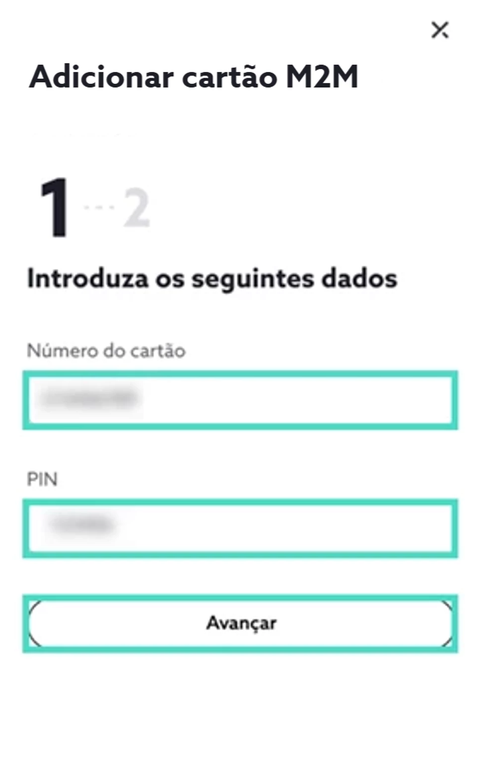 - Insira o número do cartão que quer associar e o respetivo PIN. Em seguida, selecione "Avançar";