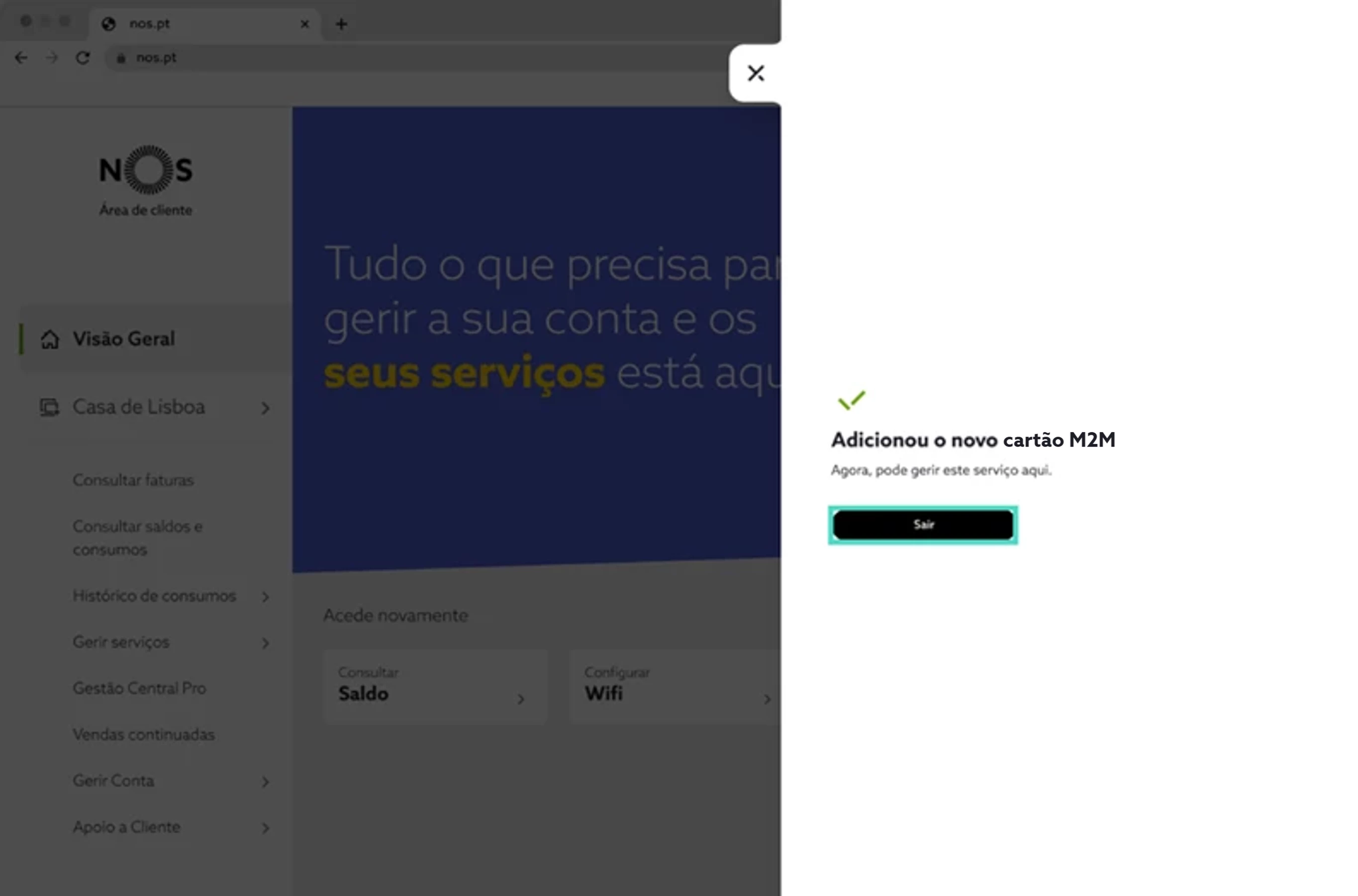 - Por fim, recebe a confirmação do serviço associado com sucesso. Selecione “Sair” para voltar à sua Área de Cliente e beneficiar de todas as vantagens.