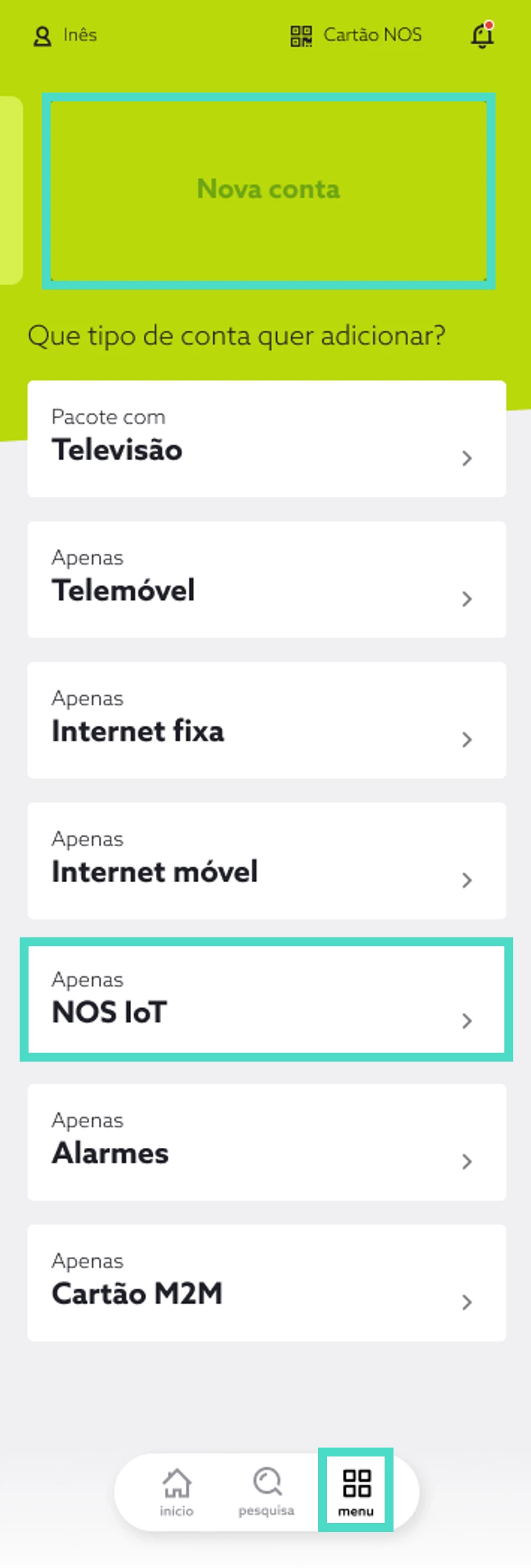 1. Aceda à app my NOS e, em “Menu”, escolha “Nova conta”. De seguida, escolha “Apenas NOS IoT”;