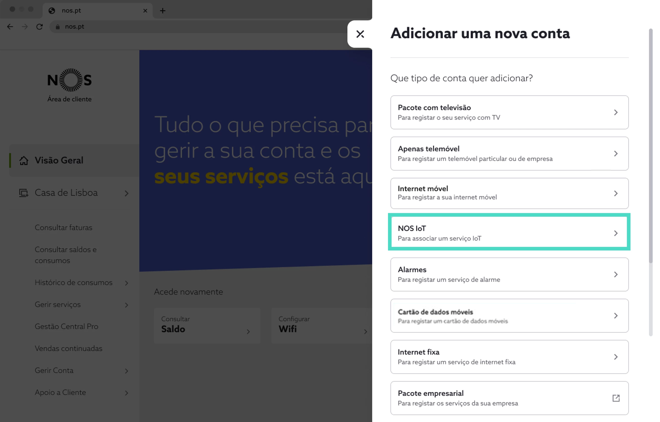 Associar serviços IoT em my.nos.pt