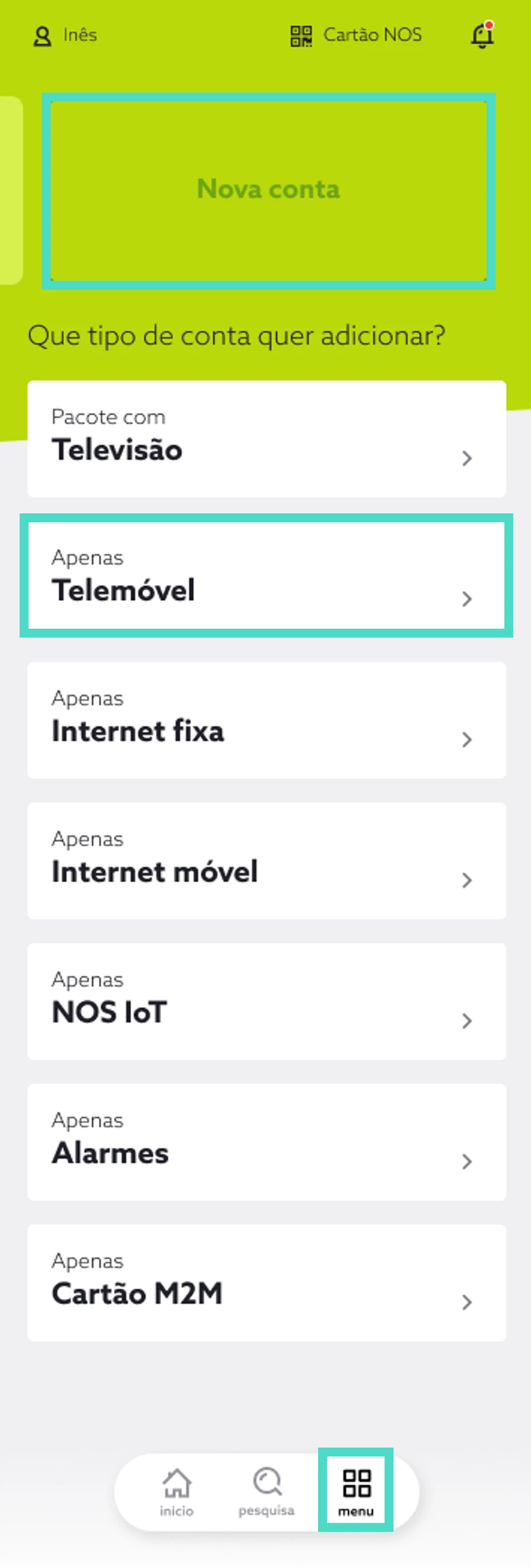 - Aceda à app my NOS e, em “Menu”, escolha “Nova conta”. De seguida, escolha “Apenas Telemóvel”;