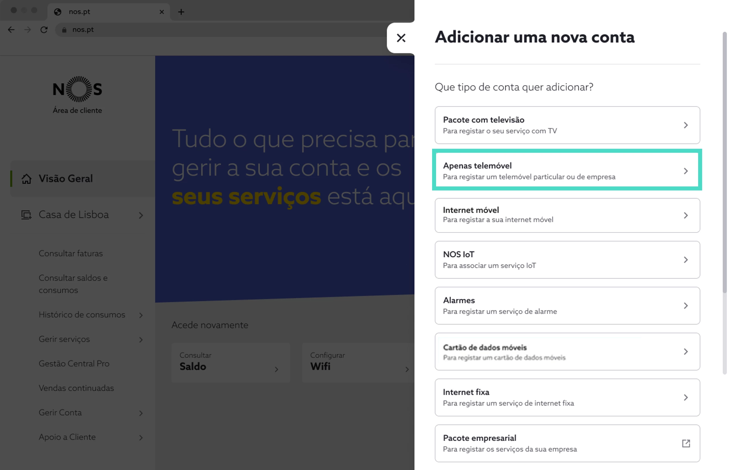 Para associar serviços de telemóvel em my.nos.pt, siga os passos abaixo:
