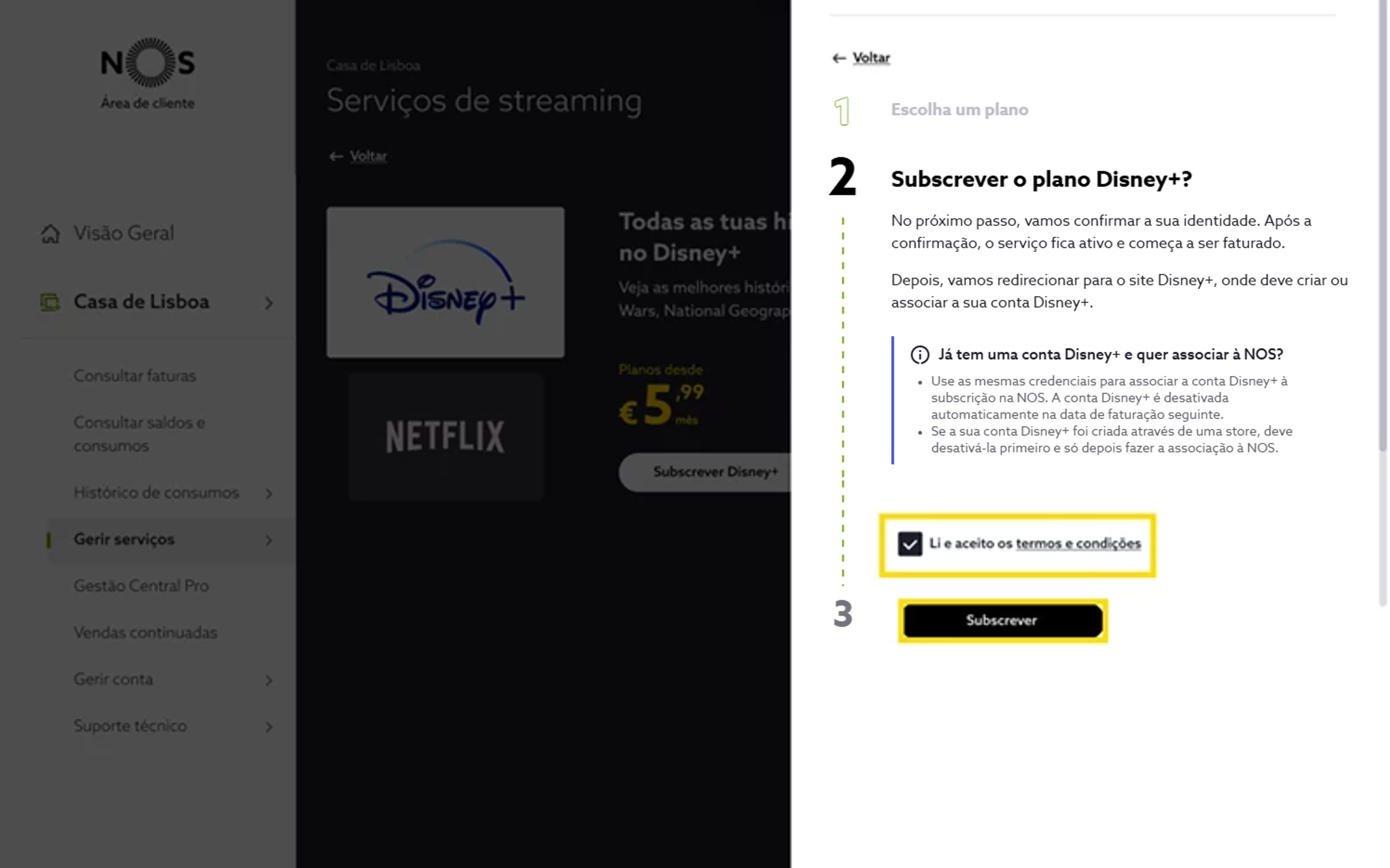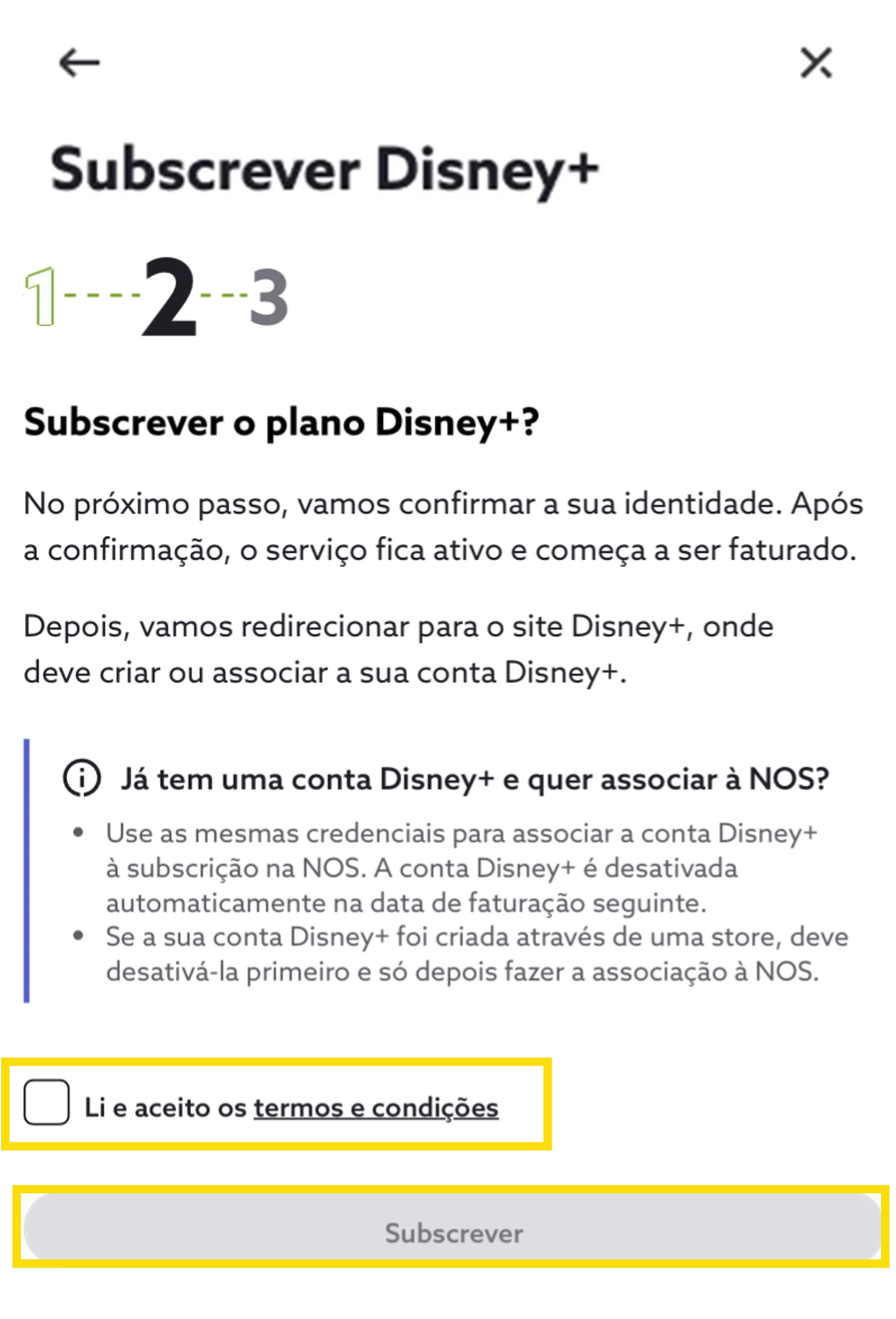 - Leia e aceite os termos e condições do Disney+ e confirme em "Subscrever" para associar à sua fatura NOS;