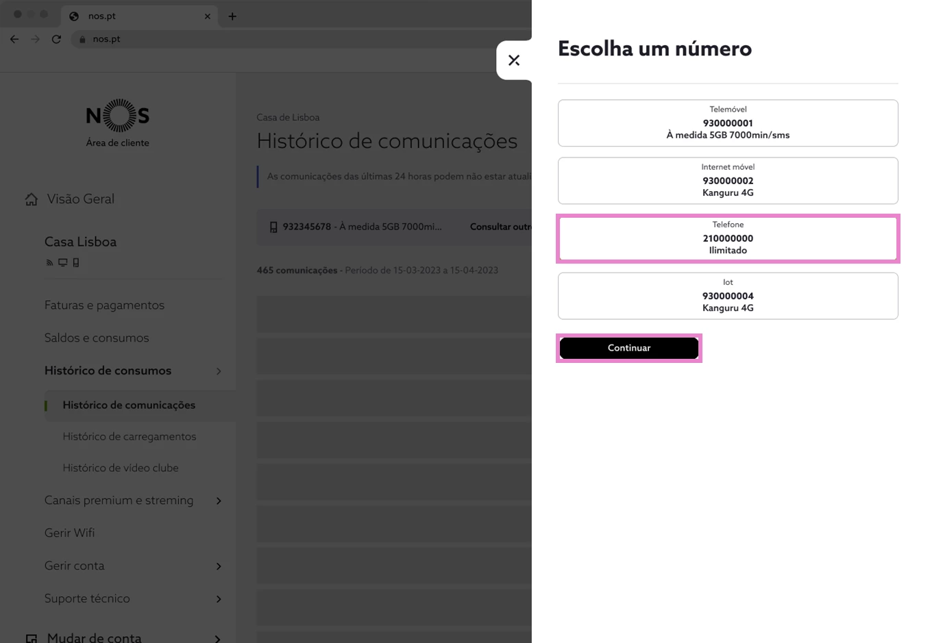 5. Escolha o número que pretende consultar e selecione “Continuar”;