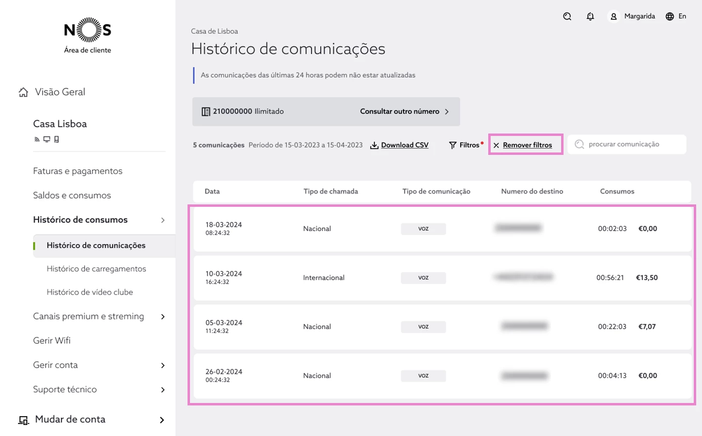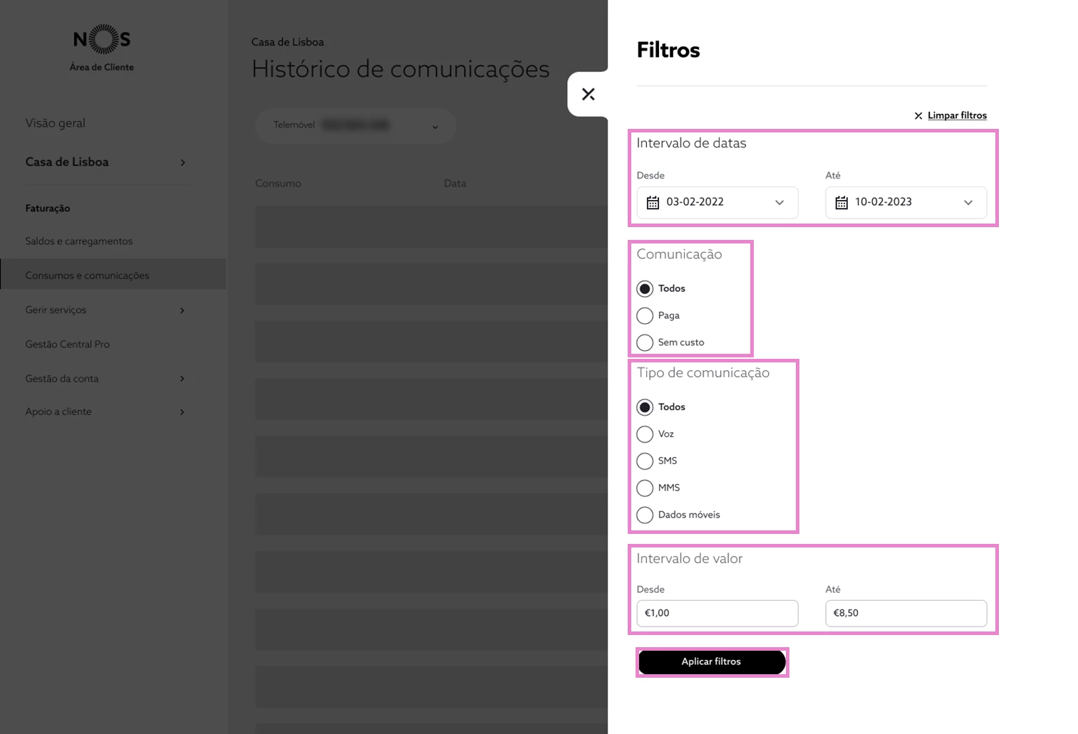 Consultar o histórico de comunicações em my.nos.pt