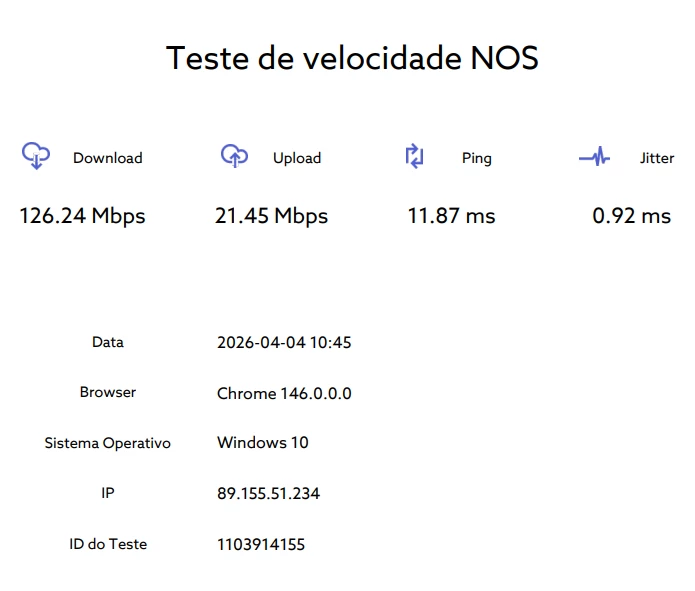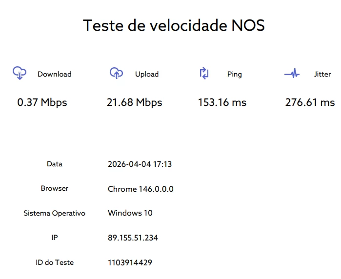 Abaixo, envio testes de velocidade a demonstrar o problema, bem como a velocidade de operação normal fora do horário problemático mencionado. Os testes foram realizados no site da NOS e conectado por cabo.