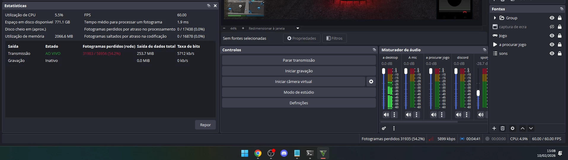 Boa Noite, Sou streamer e estou com um problema crítico de instabilidade na minha ligação de upload. Mesmo com os cabos verificados por técnicos, o meu software de transmissão (OBS) regista 42.2% de fotogramas perdidos por rede, o que torna o serviço inutilizável para o fim a que se destina.