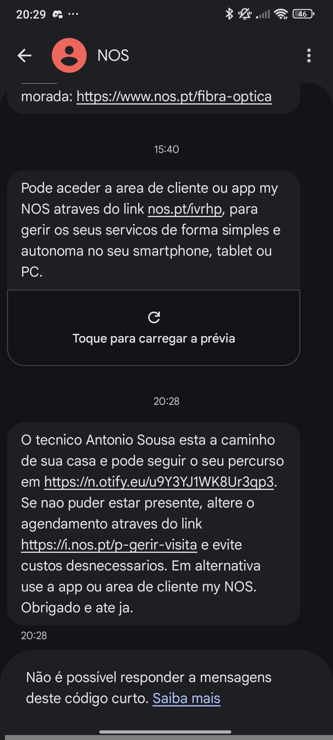 Dia 22/01/2026 foi instalado a NOS em casa e no dia 07/02/2026 eu fiquei sem Internet, falaram que iriam enviar um técnico pro dia 20, depois falaram que era avaria geral e cancelaram o técnico, aí já mandaram outro e fica nesse lenga lenga e não resolve nada, hoje dia 16 eu estou sem Internet ainda, um técnico veio em casa e deixou o meu cabo da fibra desconectado de dentro do quadro da NOS e trancou a porta. Se é avaria geral ou não eu não sei, mas se meu cabo não for conectado no quadro eu ainda continuarei sem Internet. No site eu estou com o endereço errado e não posso arrumar. Havia um técnico marcado pra hoje das 17h às 21h, às 20h20 foi enviado mensagem que ele estava a caminho e as 20h22 foi enviada outra que ele não vinha mais e iriam remarcar pra outro dia, assim está sendo meus serviços com a NOS. Eu achava que estava ruim com a MEO