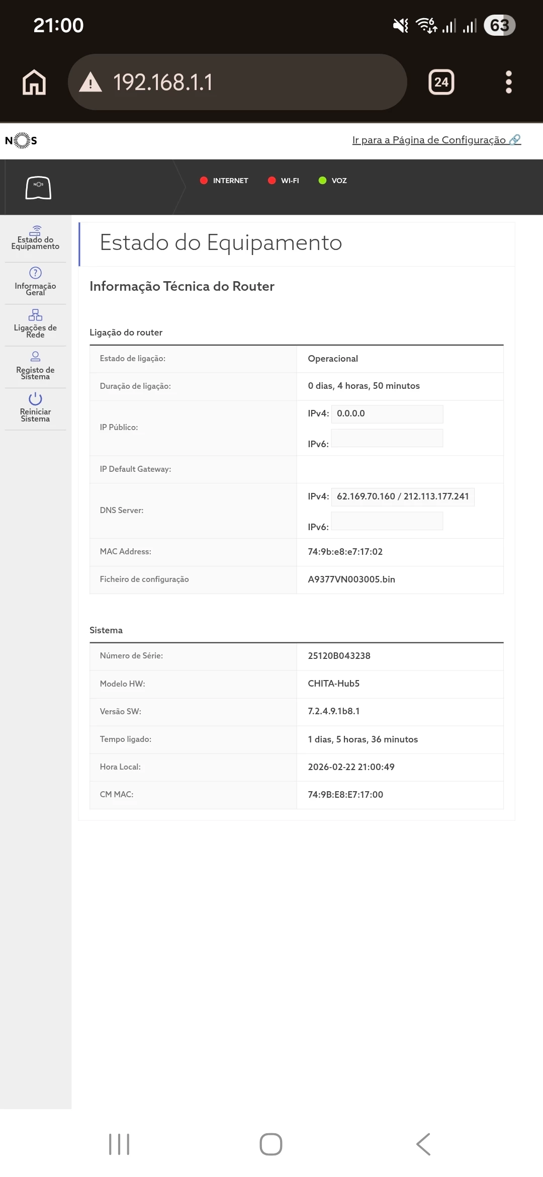 Tenho o router 5.0 v2 e está constantemente a perder o IP publico de ligação ao serviço de internet, e tenho sempre de reiniciar o router para resolver. Já várias vezes pedi para solucionarem e nada, que o problema é da ligação, ao que o técnico quando testa, nada detecta. Recentemente noutro andar mandei colocar fibra da WOO e o técnico mais uma vez mencionou que o que ocorre no router 5.0 v2 da NOS é mesmo problema do router e não da ligação e disse para pedir a substituição. Como resolvo isto?