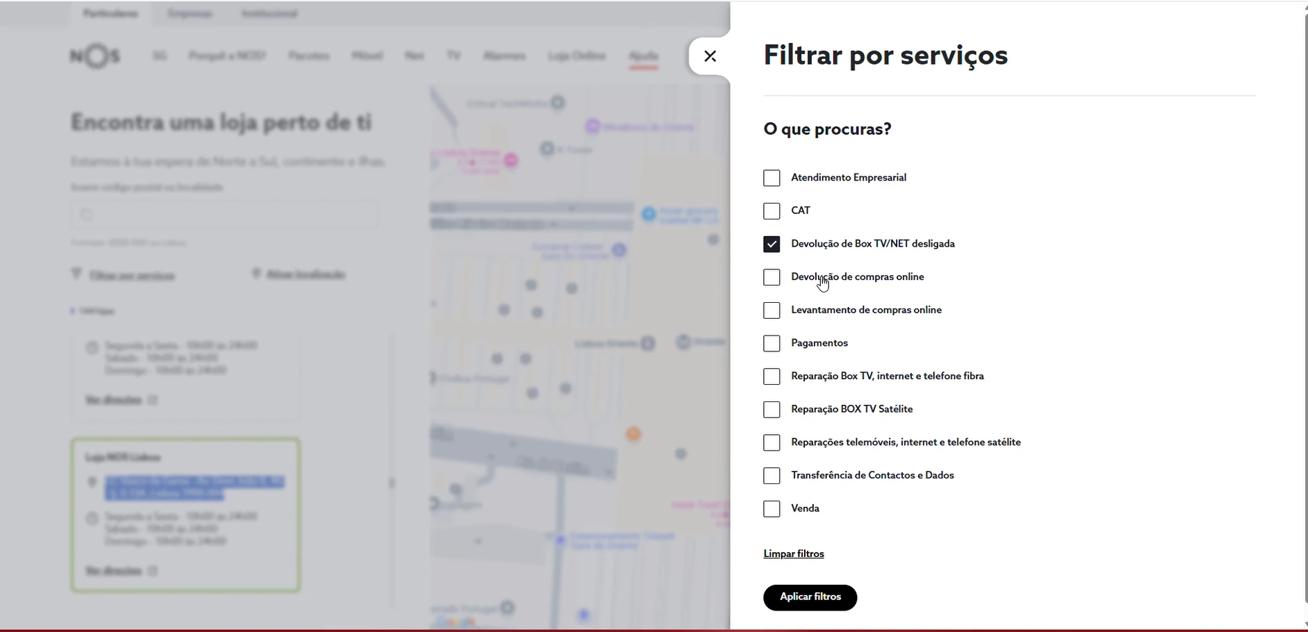 Ao aplicar neste momento o mesmo filtro, a loja que indica não surge disponível.