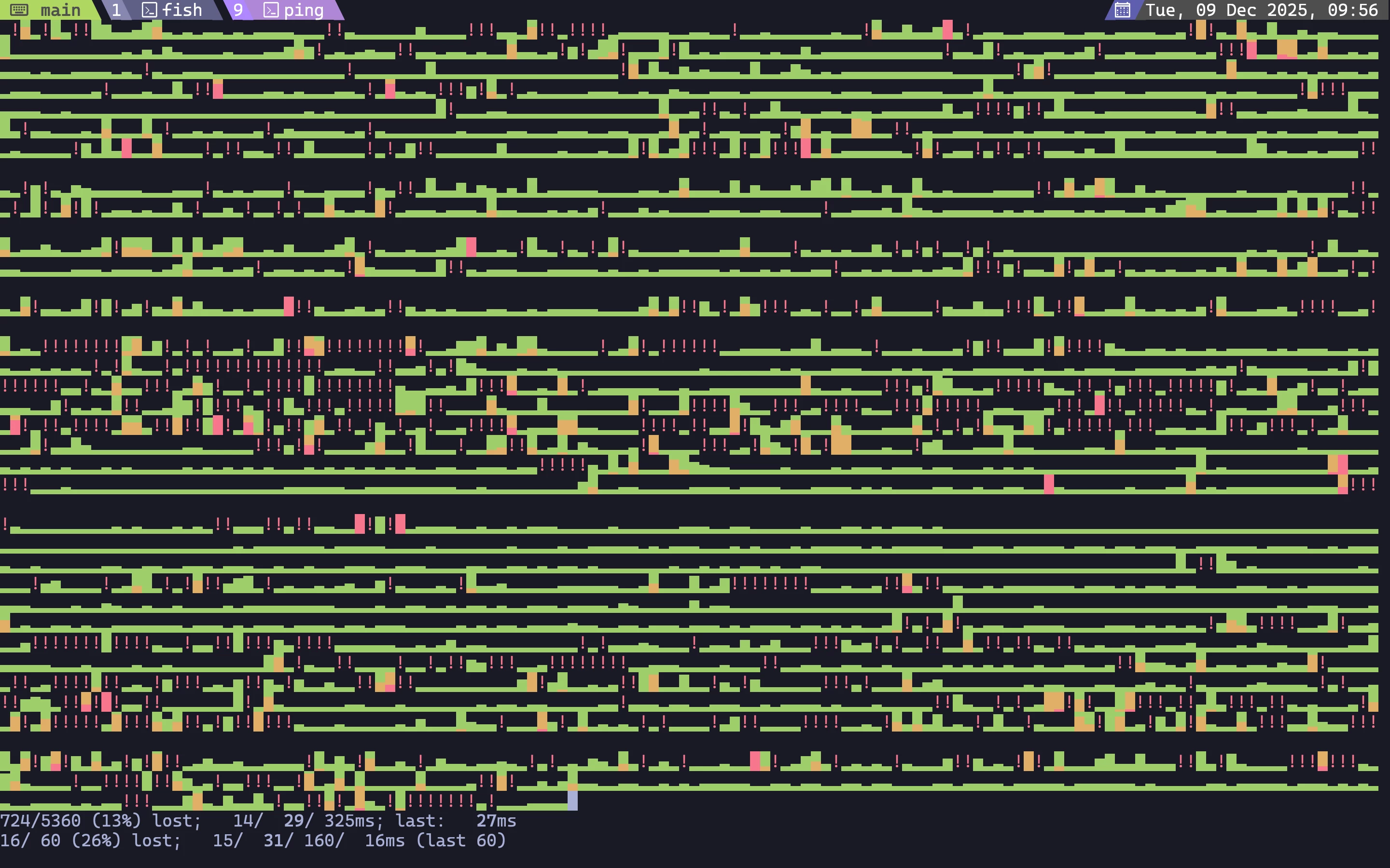 Temos serviço de Internet, TV, e Voz da NOS há vários anos (apenas 120/20 Mbps por cabo) e o serviço nunca esteve dão degradado como no último mês. Gostava de saber se existe alguma causa conhecida de problemas técnicos no exterior que afetem a zona de Arcozelo, Vila Nova de Gaia. A ligação no router nunca foi abaixo, mas temos imensas perdas de sinal tanto na TV como na internet. Anexo um output visual da análise do ping. Conforme se vê aí, estamos com 13%-26% de perda de sinal.