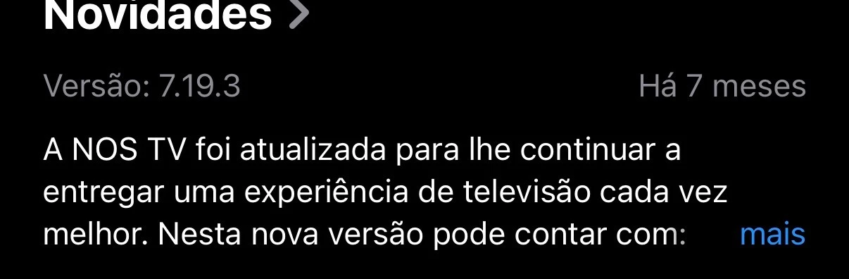 Enfim já começa a ser cansativo a incompetência de uma empresa, que se considera premium no mercado das telecomunicações. mas premium é só mesmo o nome. Porque a qualidade do serviço não tem nada de premium. Desde Junho para se resolver uma situação. Sim porque as versões beta servem para as empresas trabalharem nas apps para quando sair a versão oficial não existir estes problemas , mas se formos pesquisar um pouco a NOS não quer saber disso , temos a App NOS TV no iPhone que não é atualizada a 7 meses é uma loucura. Enfim NOS acho que o melhor mesmo é abrir queixa junto da Anacom porque não deve ser legal cobrar aos utilizadores o mesmo valor de uma App funcional de uma App que só funciona metade , é triste uma empresa ter estas atitudes , enfim não tenho palavras para esta frustração… Todas as outras operadoras com apps a funcionar bem e nós aqui os únicos a pagar uma App para ver dentro da própria casa e ainda por cima sem funcionar bem. (A foto a cima é do telemóvel , para mostrar a quanto tempo nós não otimiza uma App )