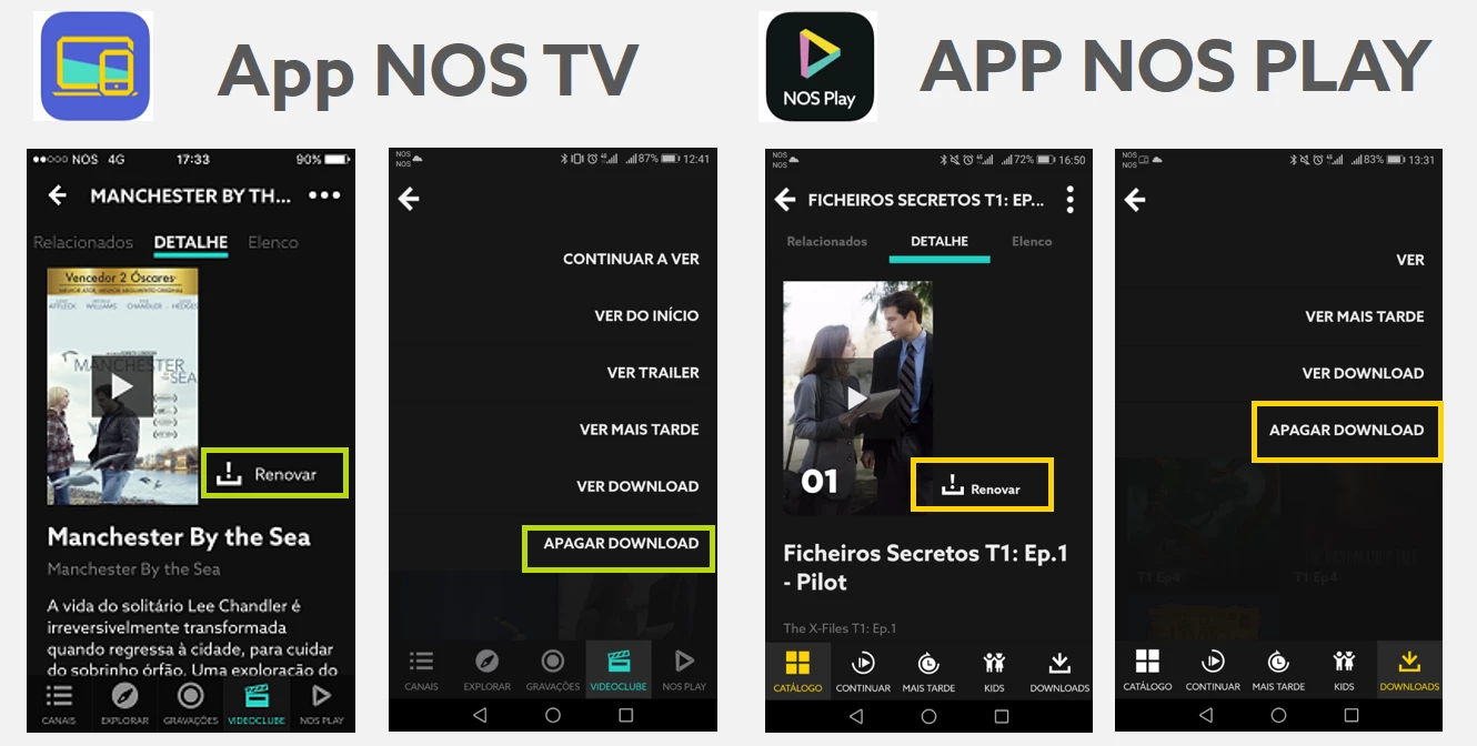 - para a App NOS TV, no menu "Videoclube", aceda a "Downloads" e selecione o conteúdo que pretende renovar ou apagar. Na App NOS Play aceda ao menu "Downloads" e selecione o filme ou um episódio de uma série. Conseguirá renovar desde que ainda seja subscritor do serviço e se o conteúdo continuar disponível no catálogo. Para renovar, só precisa carregar em "Renovar". Para apagar, selecione os três pontos e carregue em "Apagar Download".