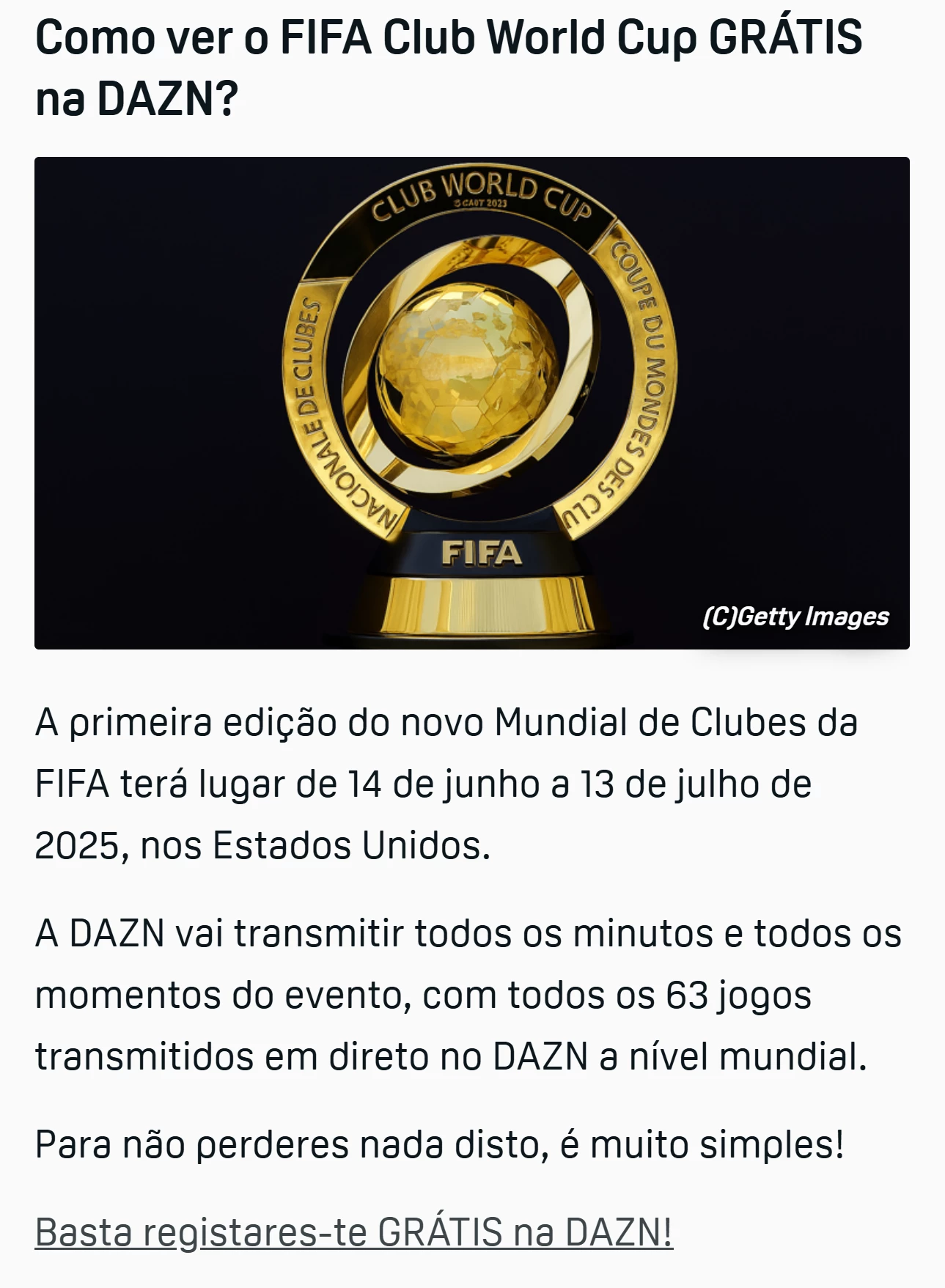 Se ainda não é subscritor DAZN e pretende assistir ao Mundial de Clubes FIFA 2025, pode fazer o seu registo gratuito diretamente na DAZN aqui.