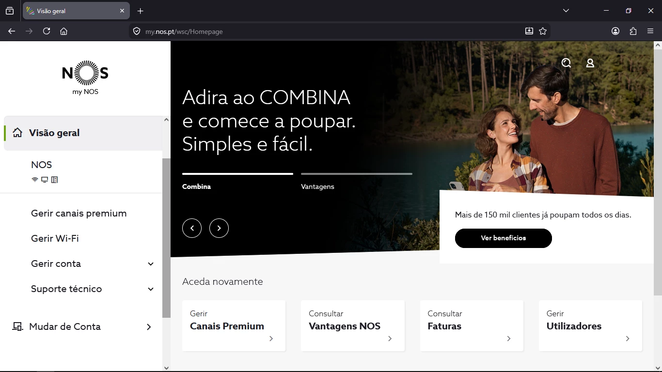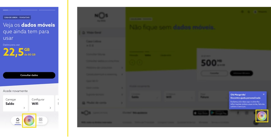 Na área de cliente my NOS, o Assistente Virtual está disponível através do ícone circular no canto inferior direito, visível ao longo da navegação. A Pesquisa (lupa) mantém-se disponível na área de cliente my NOS em navegadores.