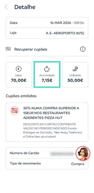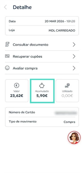 - Em “Acumulado” está o valor que acumulou, resultante do desconto aplicado ao valor total da compra.