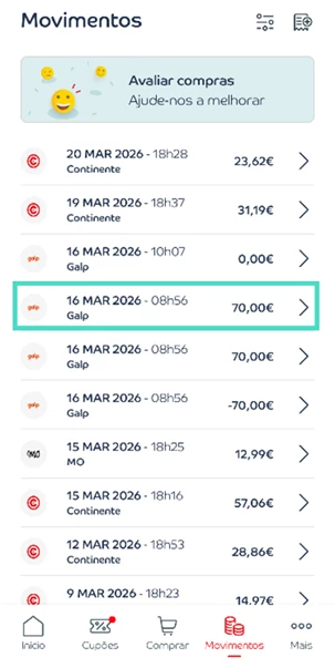 - No dia do abastecimento, aceda à app Cartão Continente e, em “Movimentos”, selecione “Compra Galp” e verifique quanto acumulou em “Acumulado €X – correspondente ao desconto do seu nível COMBINA”;