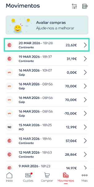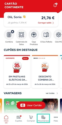 - Aceda à app Cartão Continente e selecione “Movimentos”;