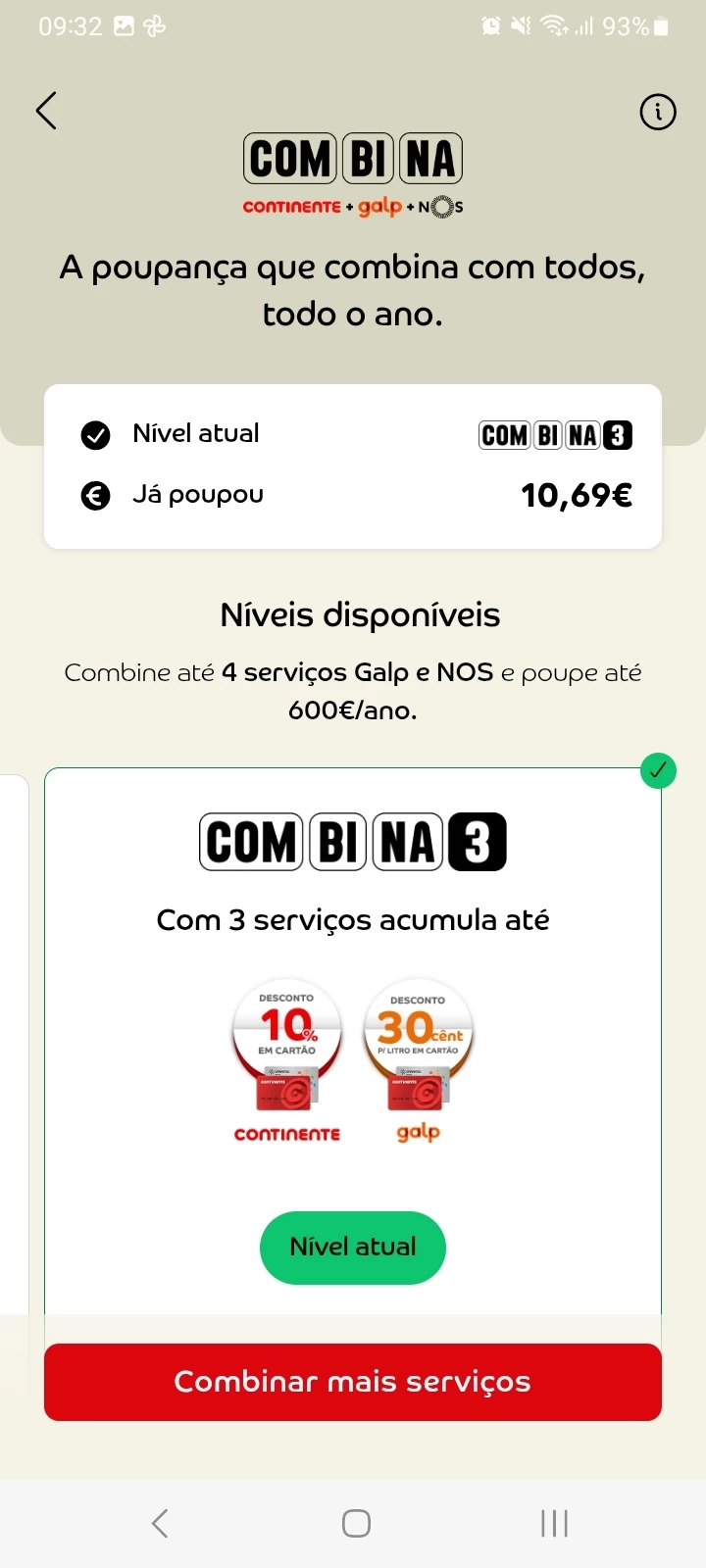 Acima, em “Eu poupo”, pode ver um resumo do nível Combina, nível 1, 2 ou 3, e até quanto pode poupar ao aderir.