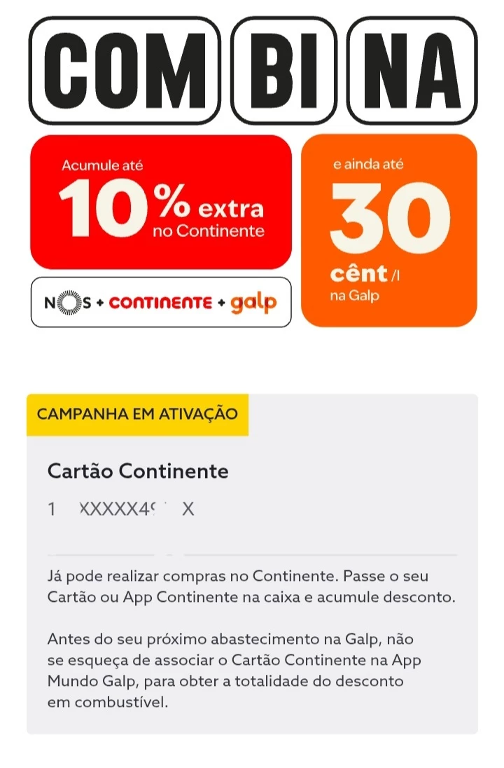 Altere o seu plano de energia para o COMBINA e associe o seu Cartão Continente à app Mundo Galp. - Associe a NOS