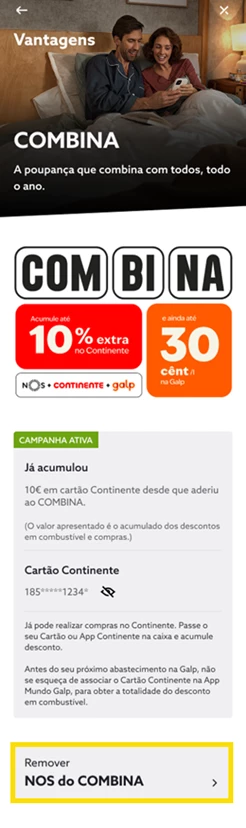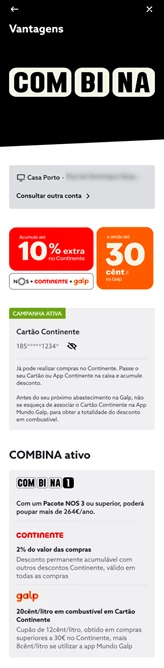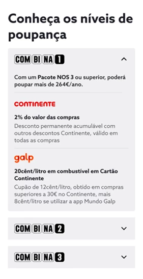 O COMBINA, uma colaboração entre a NOS, a GALP e o Continente, é o programa que o ajuda a poupar todo o ano por ser cliente, com descontos conjuntos das 3 marcas que fazem parte da sua vida.
