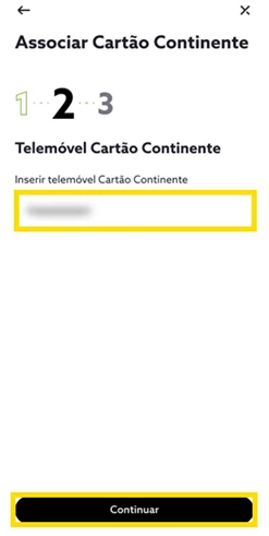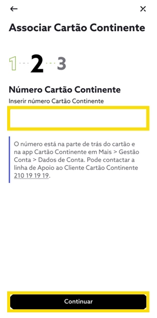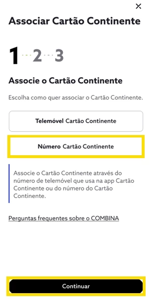 - Em seguida, associe o Cartão Continente através do número de telemóvel que usa na app Cartão Continente ou do número do Cartão Continente e selecione “Continuar”;